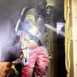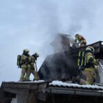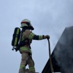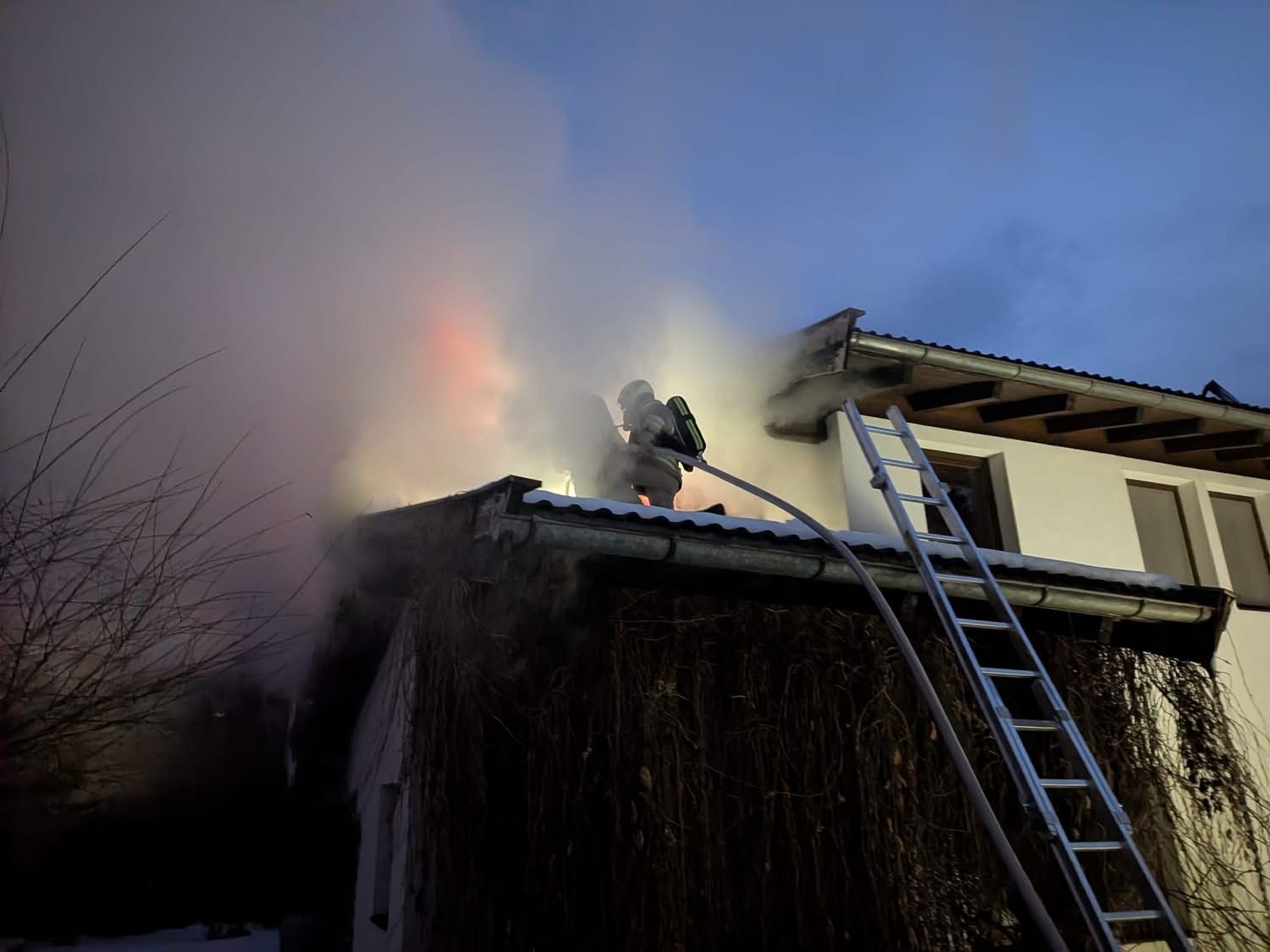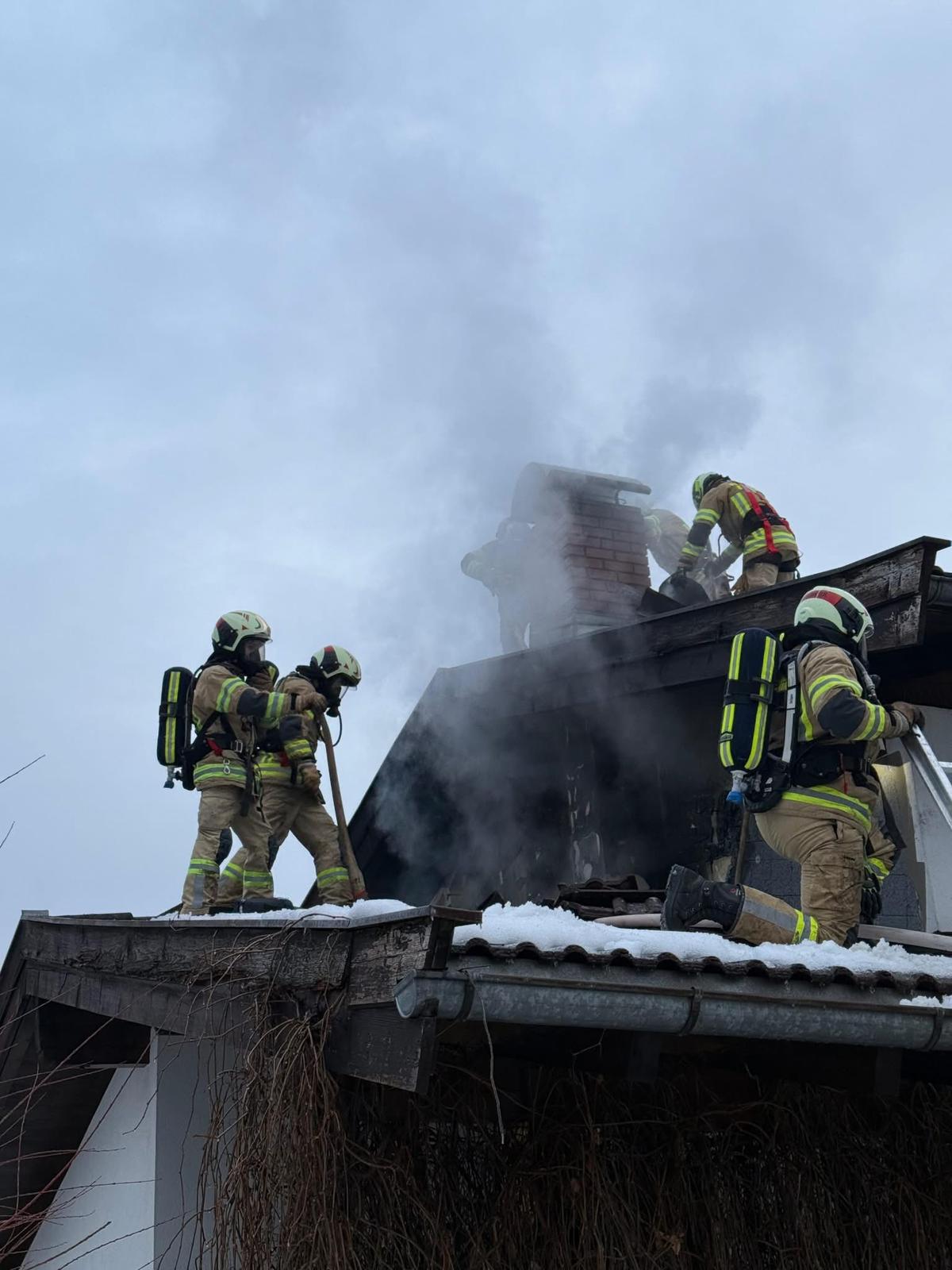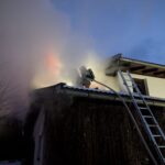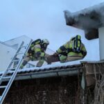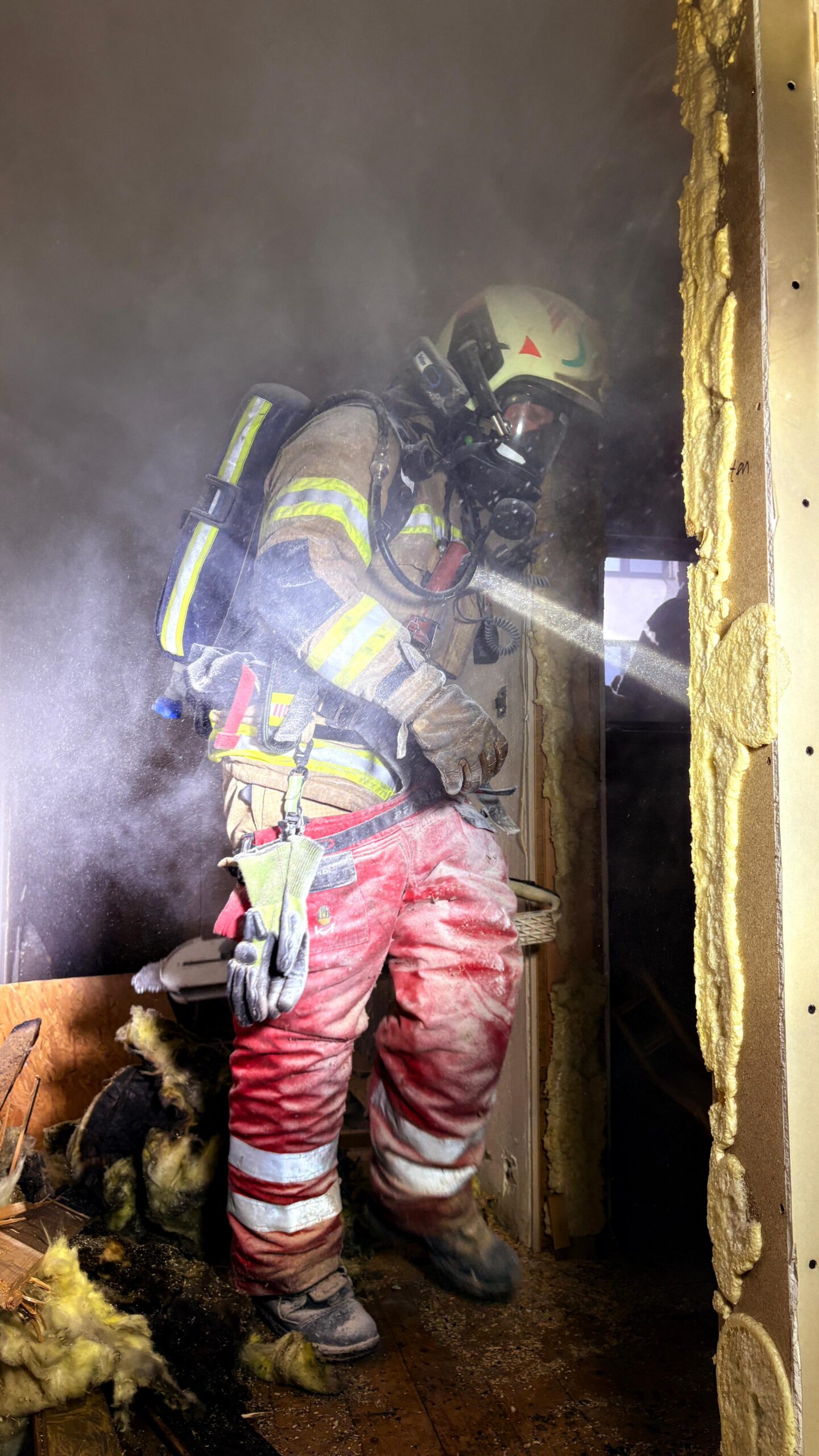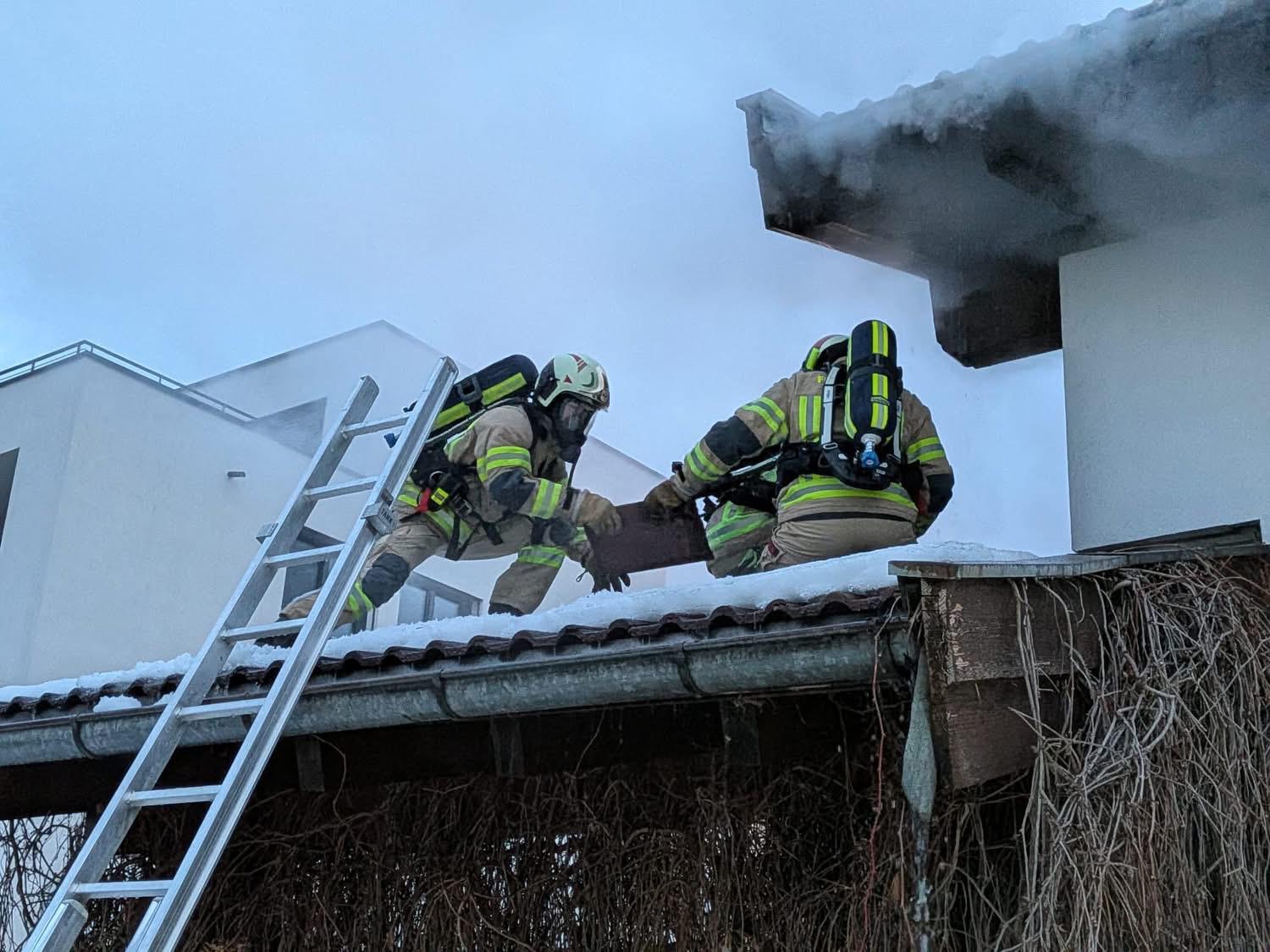 Die Brandbekämpfung erfolgte über einen kombinierten Innen- und Außenangriff mit insgesamt drei Atemschutztrupps. Zusätzlich wurde über die Drehleiter ein Löschangriff von außen über das Dach durchgeführt. Zur gezielten Brandbekämpfung und Kontrolle auf Glutnester mussten Dachöffnungen mit Motorsägen geschaffen werden.