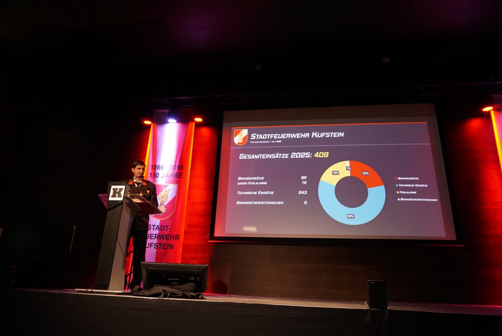 Im Rahmen der Versammlung wurde die Einsatzstatistik des vergangenen Jahres präsentiert. Die STADTFEUERWEHR Kufstein leistete 409 Einsätze und absolvierte 127 Übungen. Statistisch gesehen rückte die Feuerwehr im vergangenen Jahr damit etwa alle 21 Stunden zu einem Einsatz aus. Ein besonderer Dank gilt allen Mitgliedern für ihr Engagement und die investierte Zeit.