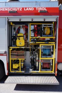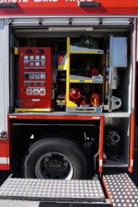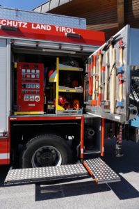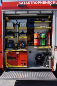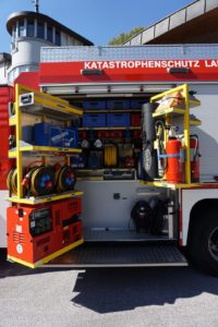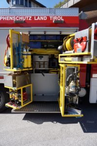 ein Einbauaggregat, ein Gefas-Schnellangriff, einen Druckluftschlauch, Ölbindemittel und Auffangmaterial, Motor- und Rettungssäge mit Schutzausrüstung, eine Tauchpumpe, Werkzeugwand mit Folienschlauch