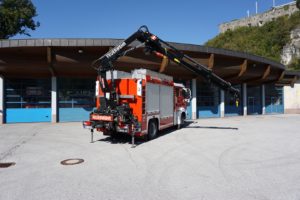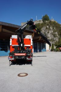 HIAB Kran mit 750 kg Last bei 14 m Ausladung. Weiters befindet sich eine Seilwinde am Kran die vorwiegend zur Personenbergung eingesetzt wird.