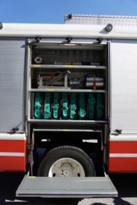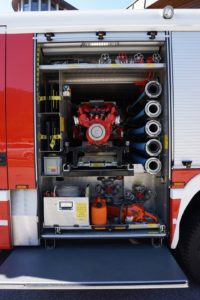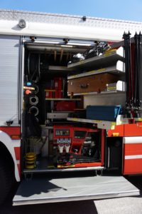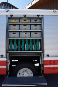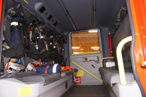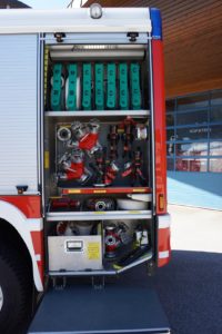 3 Atemschutzgeräte 300bar, 2 Rettungsleinen, Atemschutzfunk, Reserveflaschen, 2 Triopane, 2 Analogfunk HFG, Digitalfunk HFG und Mobil, 2 Handlampen, FW-Gurte, Handschuhe
