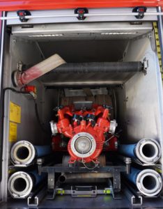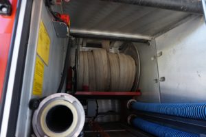 3 Verteiler, 2 Hohlstrahlrohre B, 2 Stützkrümmer, 6 Hohlstrahlrohre C, 2 B-Schläuche, 7 C-Schläuche, div. Übergangsstücke, div. Schlauchbinden, Fernbedienung für Haspel und Pumpenlift hinten