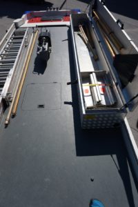 4 tlg. Steckleiter, 2 Einreißhaken, 4 Feuerpatschen, 2 Heugabeln, 2 Ausräumhaken, Schlauchbrücken, Lichtmast mit neig- und drehbaren Scheinwerfer